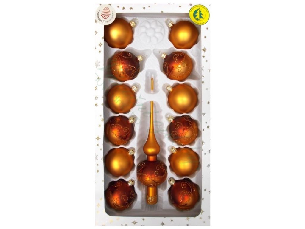 Sada koulí se špicí Skořicová s ornamentem - sada skleněných vánočních ozdob, koule se špicí