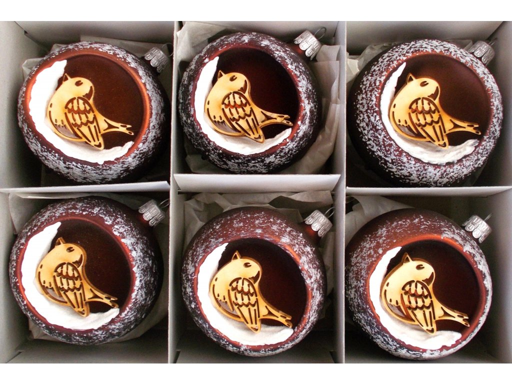 Sada vánočních ozdob Hnědá koule s vlepenou figurkou ptáčka