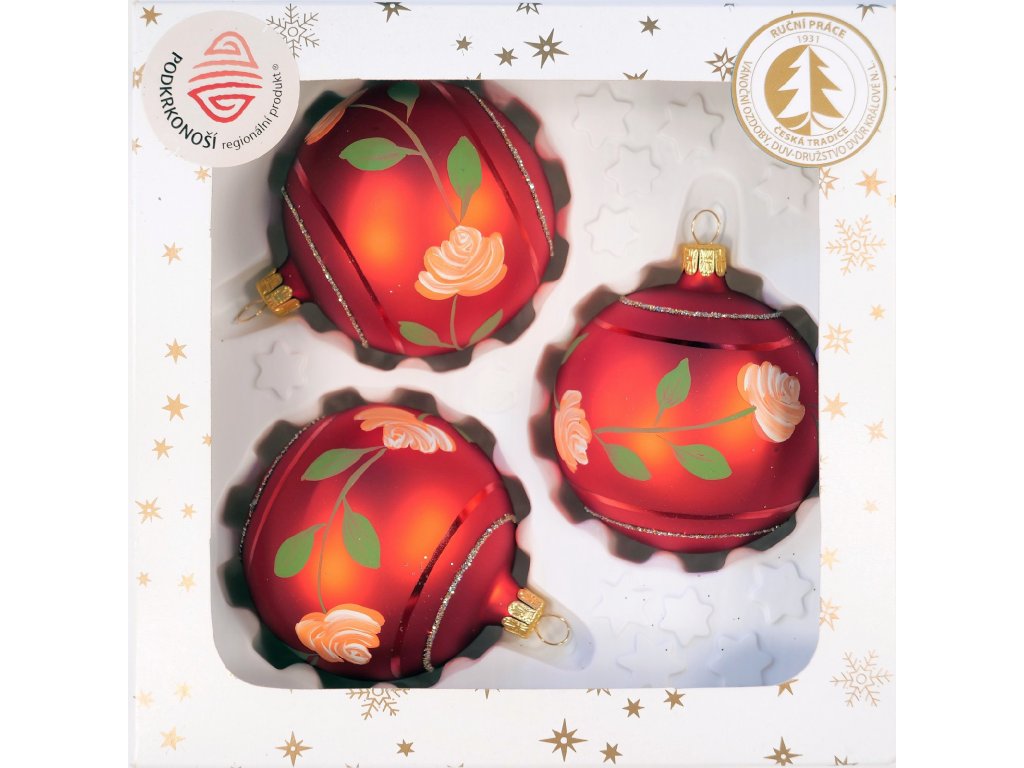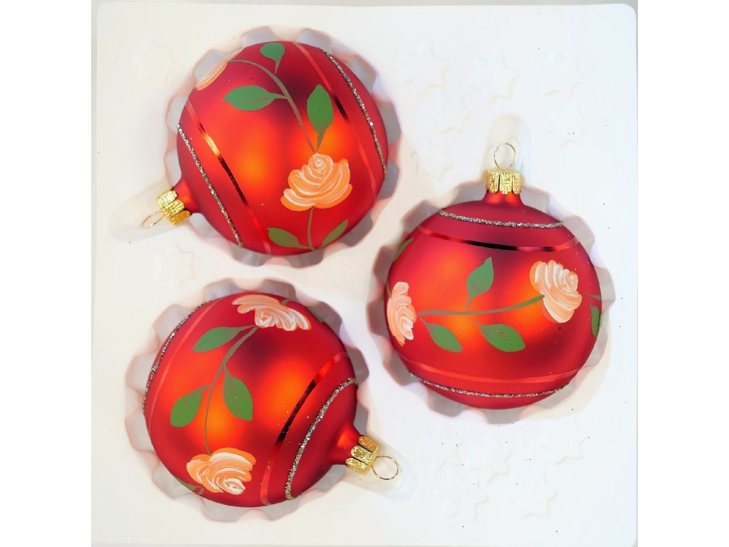 Sada vánočních ozdob koule červená matná s růžemi - skleněná vánoční ozdoba, ve tvaru koule, barva tmavě červená matná s růžemi. Vánoční ozdoba na zavěšení.