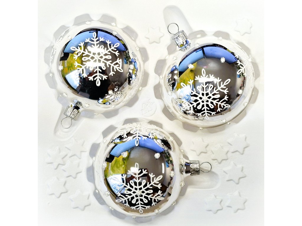 Vánoční ozdoba Koule stříbrná lesk s vločkami - sada 3 kusů