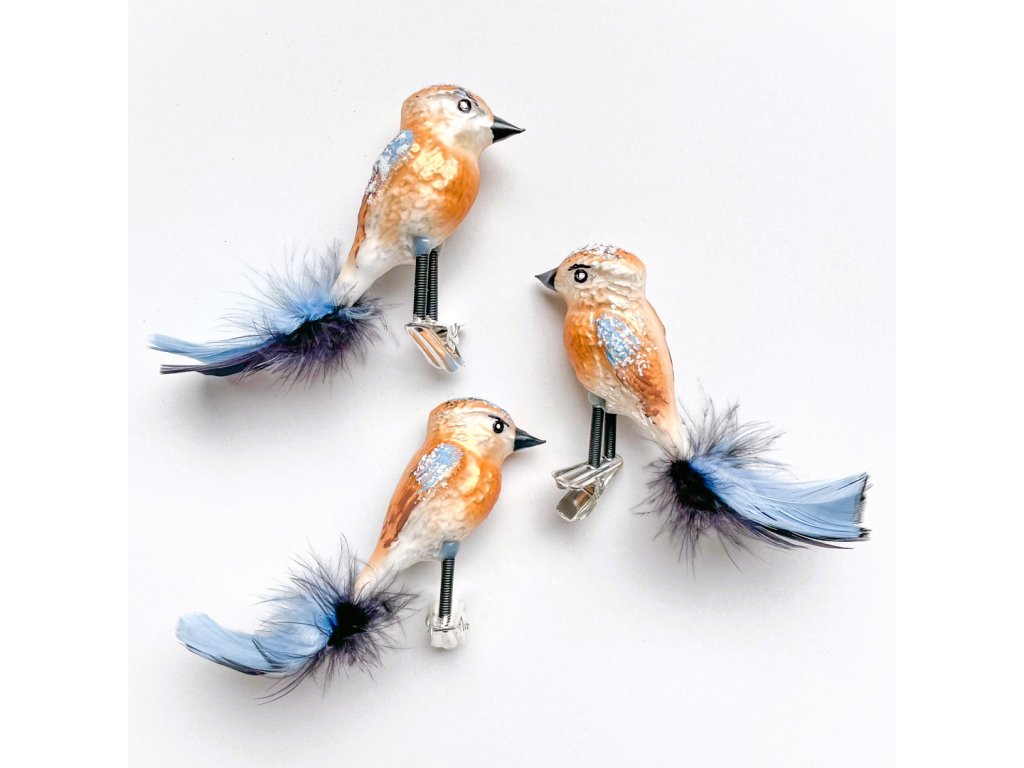 Sada vánočních ozdob Ledňáček hnědo modrý - skleněná vánoční ozdoba ve tvaru Ledňáčka.