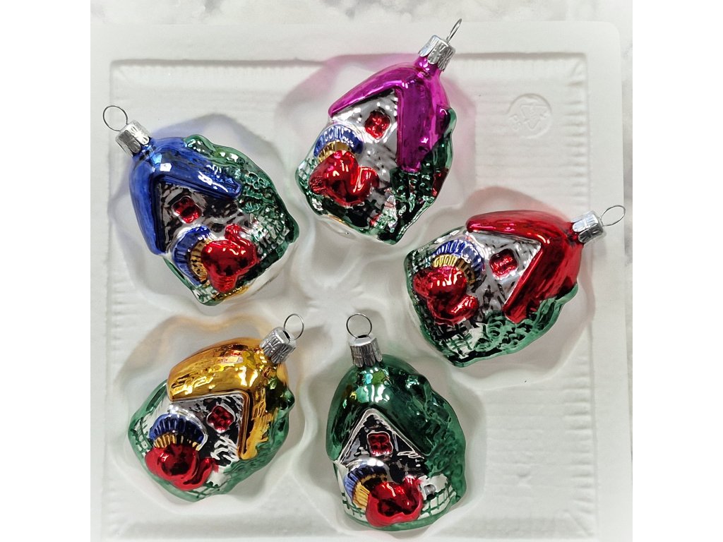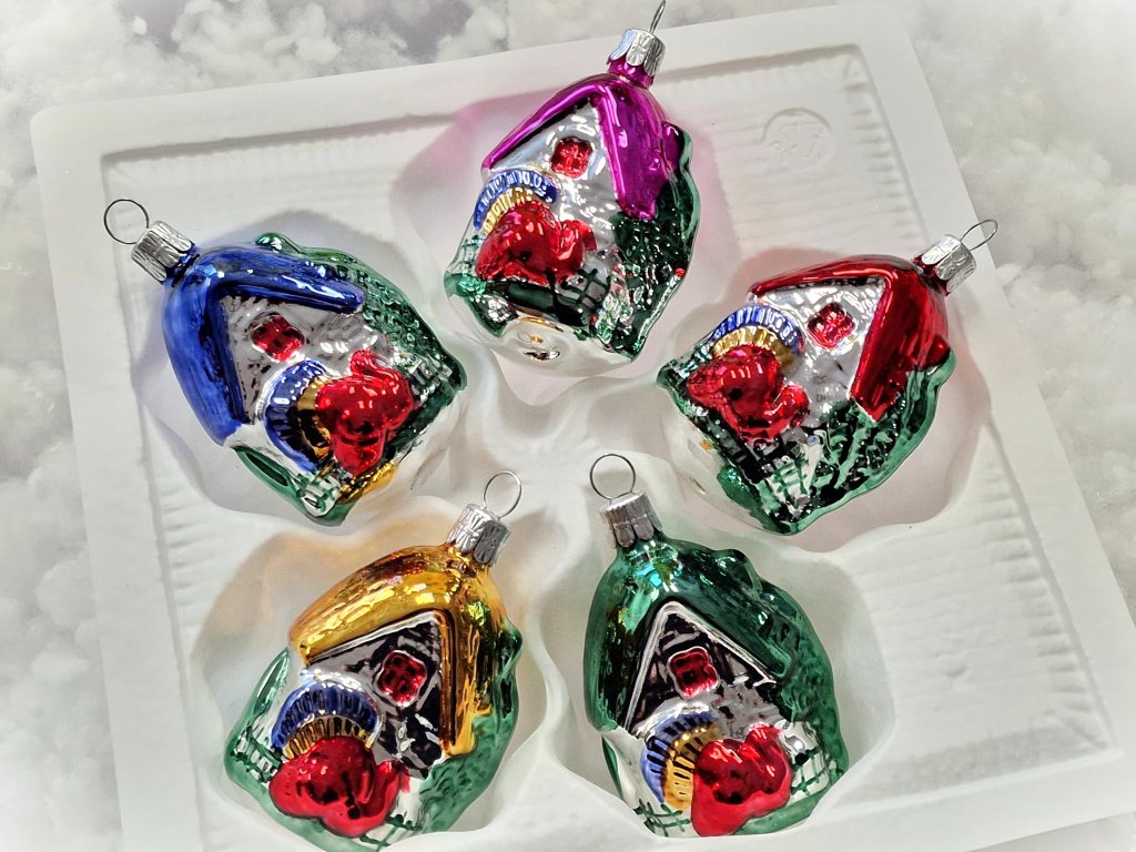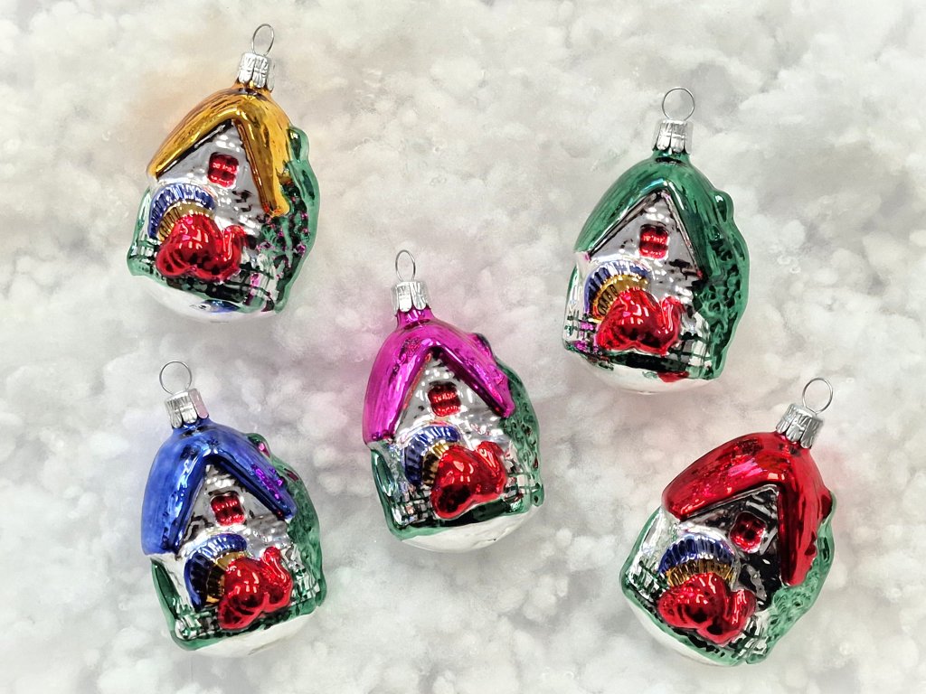 Sada vánočních ozdob Myslivna s pávem - skleněné ozdoby ve tvaru domku, myslivny. Každá ozdoba v jiné barevné kombinaci.
