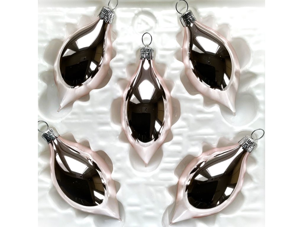 Sada vánočních ozdob Oliva světle růžová lesk - skleněná vánoční ozdoba na zavěšení. Tvar oliva, barva světle růžová, lesklá.