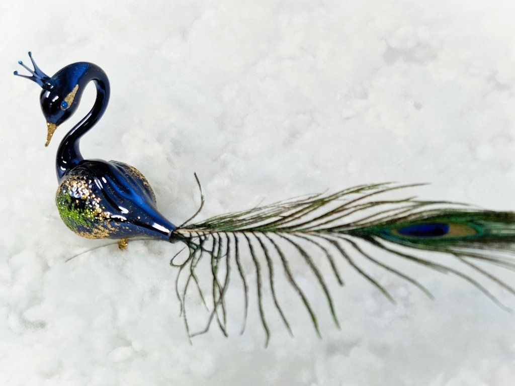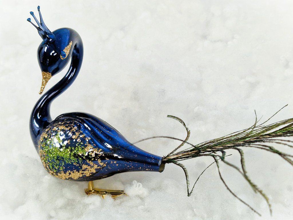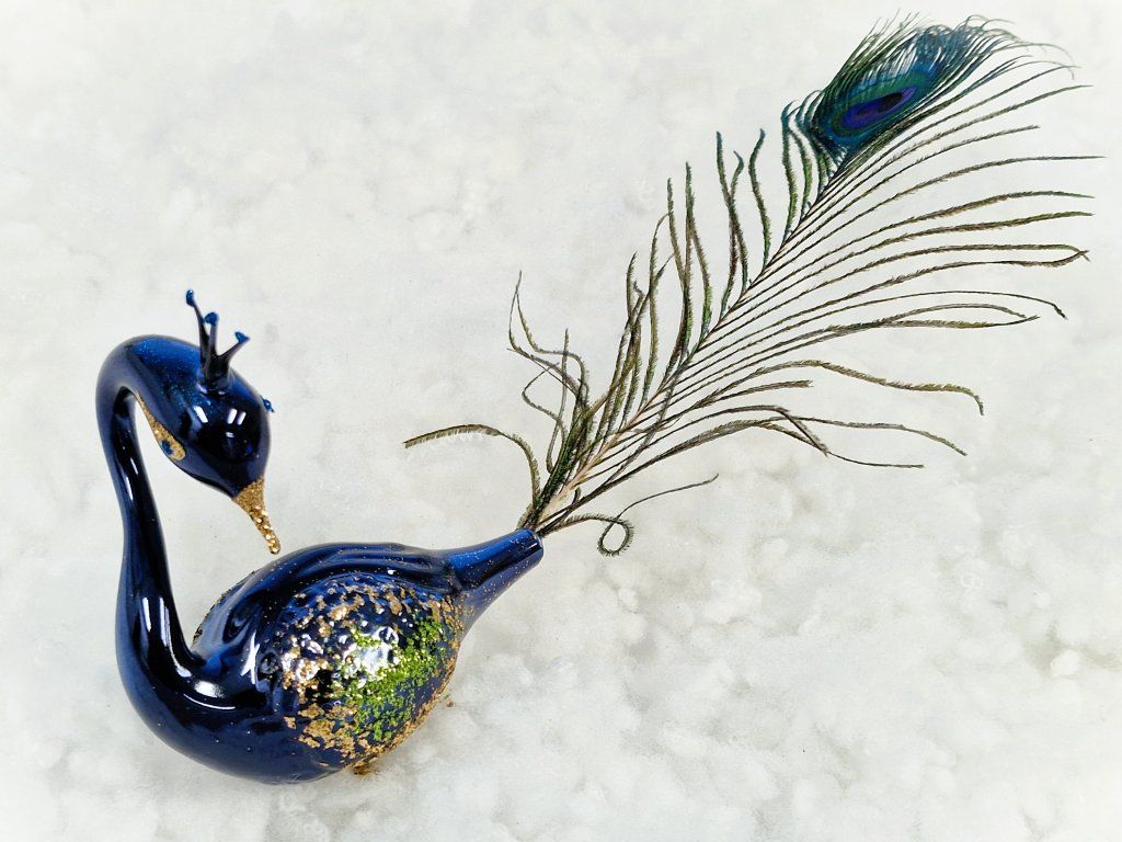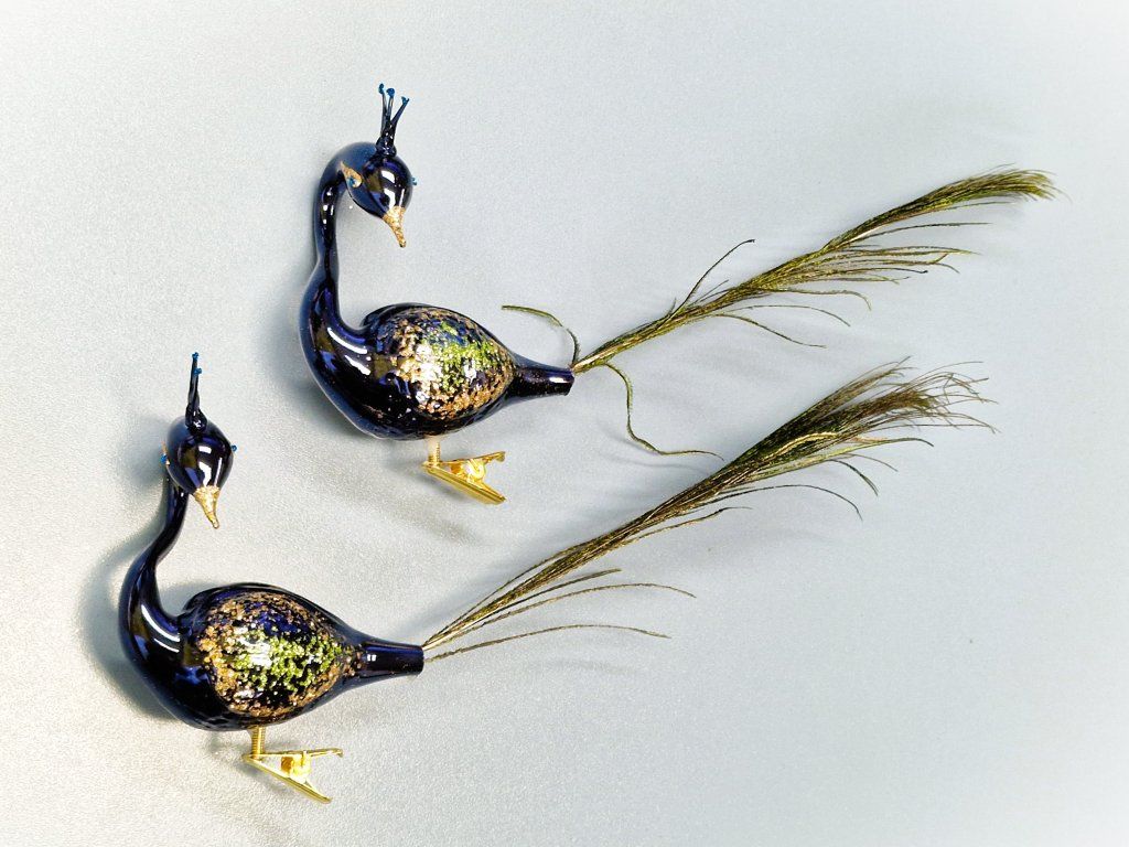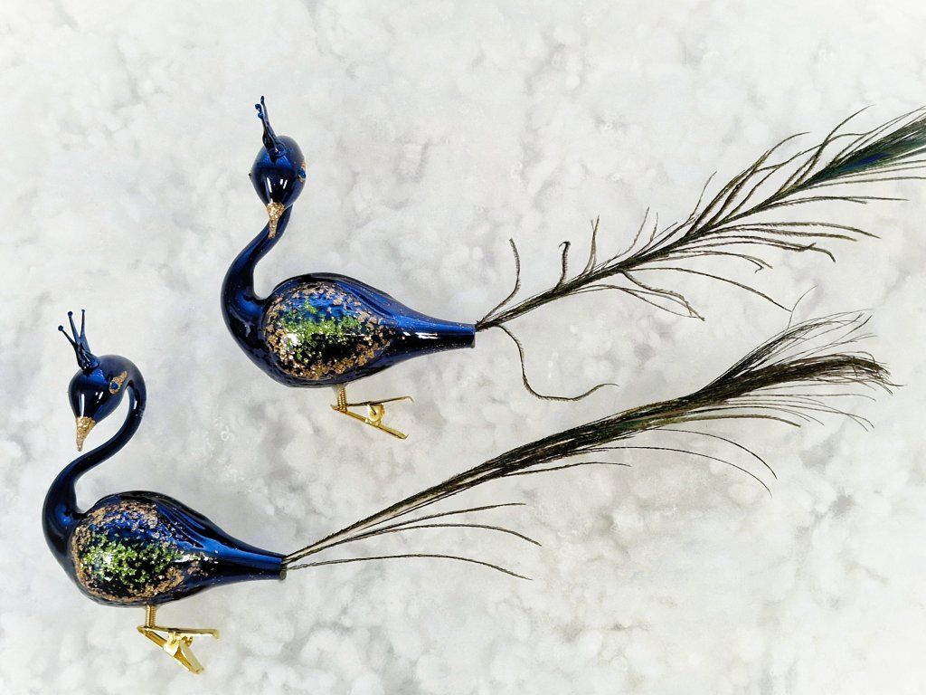 Sada vánočních ozdob Pávi - skleněné vánoční ozdoby ve tvaru páva, ptáka. Barva pávů tmavě modrá.