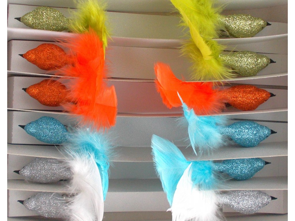 Sada vánočních ozdob Ptáček Mix barev, Zelená, oranžová, modrá, bílá - skleněná vánoční ozdoba ve tvaru ptáčka.