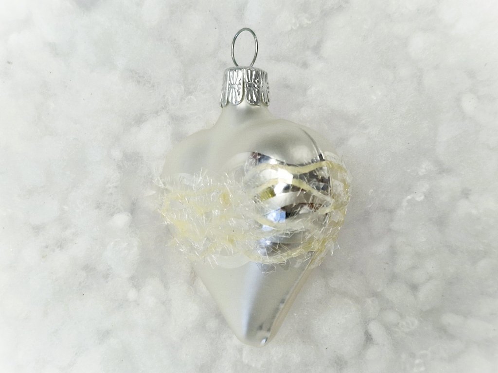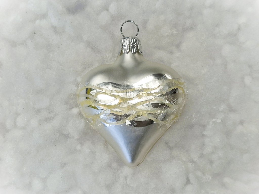 Sada vánočních ozdob Srdíčko stříbrné s vodorovnými proužky - skleněná vánoční ozdoba. Tvar srdce, stříbrná matná barva s vodorovnými lepenými proužky. Vánoční ozdoba na zavěšení.