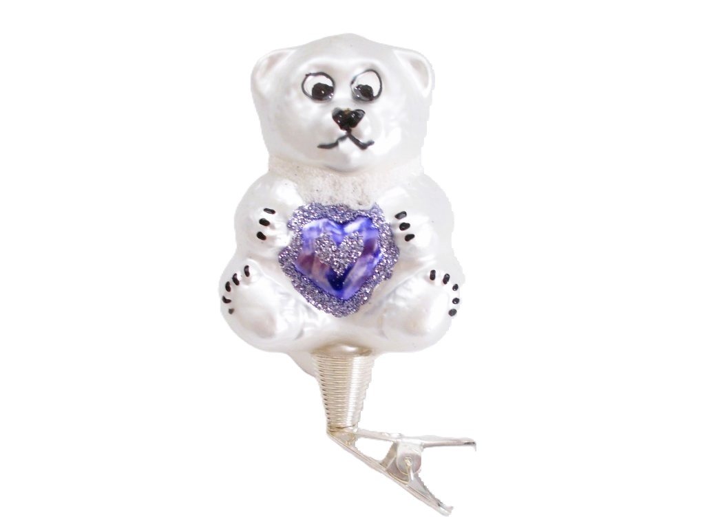 Vánoční ozdoba Bílý medvídek s fialovým srdíčkem - skleněná vánoční ozdoba, ve tvaru medvídka, barva bílá. Vánoční ozdoba se skřipcem.