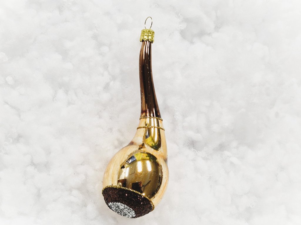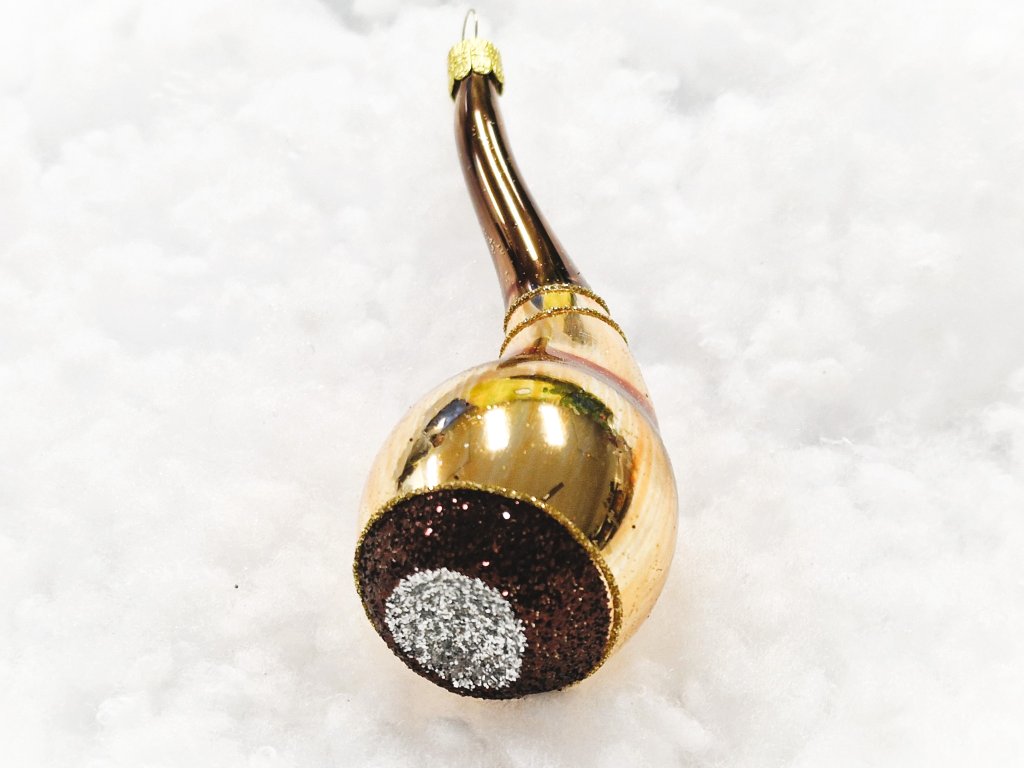 Vánoční ozdoba Dýmka čibuk - skleněná vánoční ozdoba na zavěšení. Tvar čibuk v barevné kombinaci hnědá a zlatá.