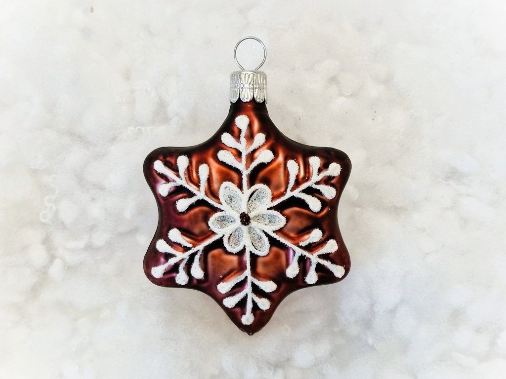 Vánoční ozdoba Hvězda s vločkou perníček hnědý - skleněná vánoční ozdoba ve tvaru hvězdy s bílou sněhovou vločkou, na zavěšení.
