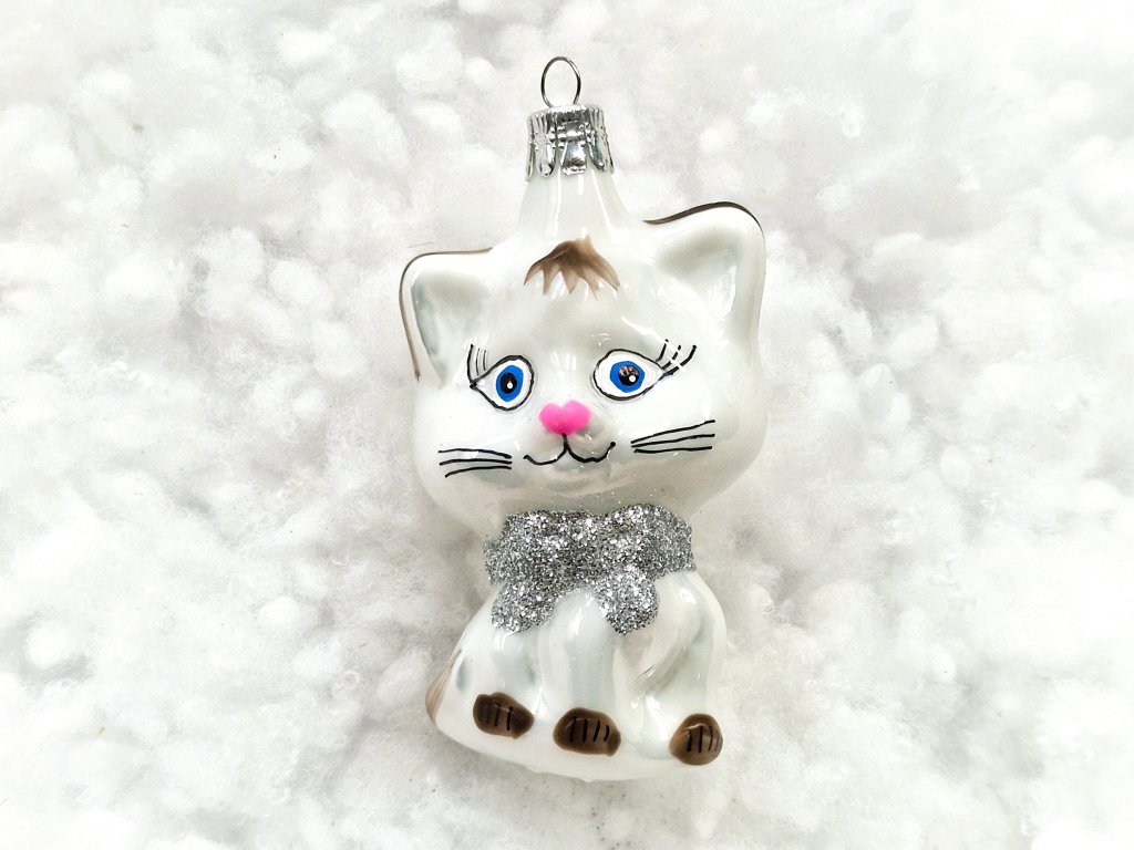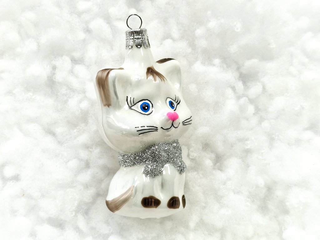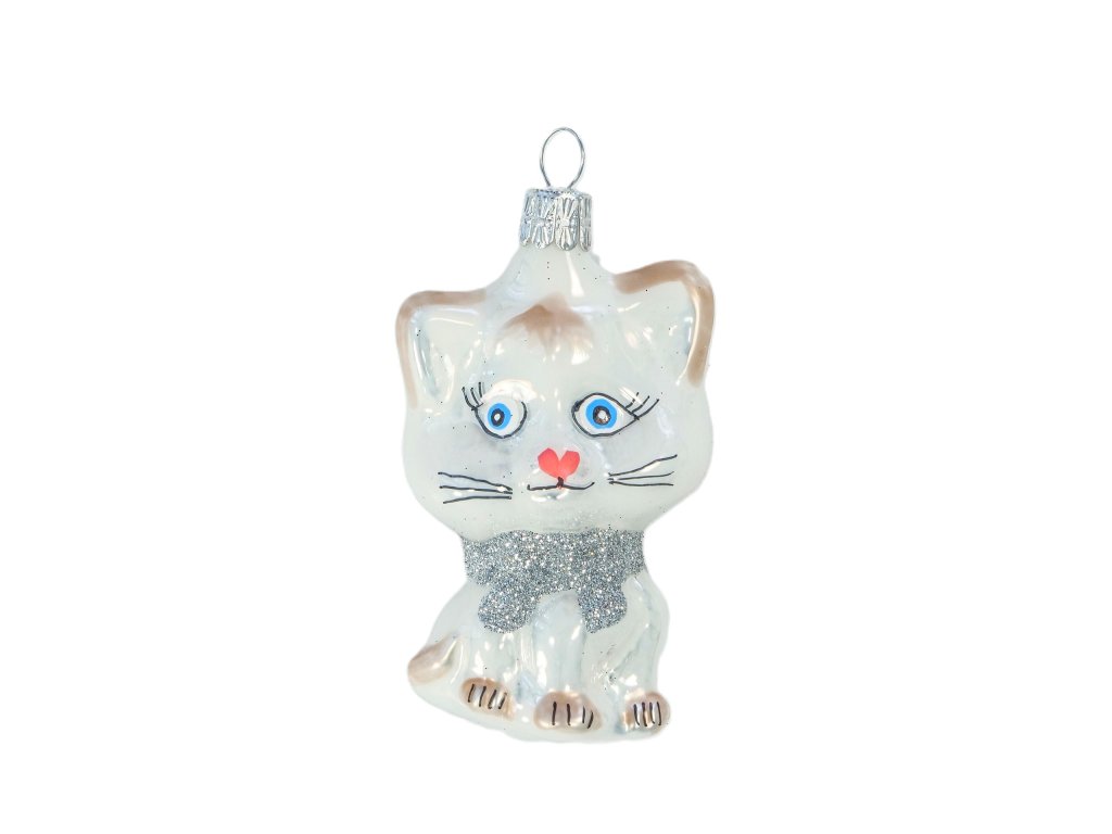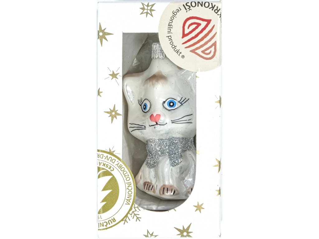 Vánoční ozdoba Kočka bílá se stříbrnou mašlí - skleněná vánoční ozdoba na zavěšení ve tvaru kočky.