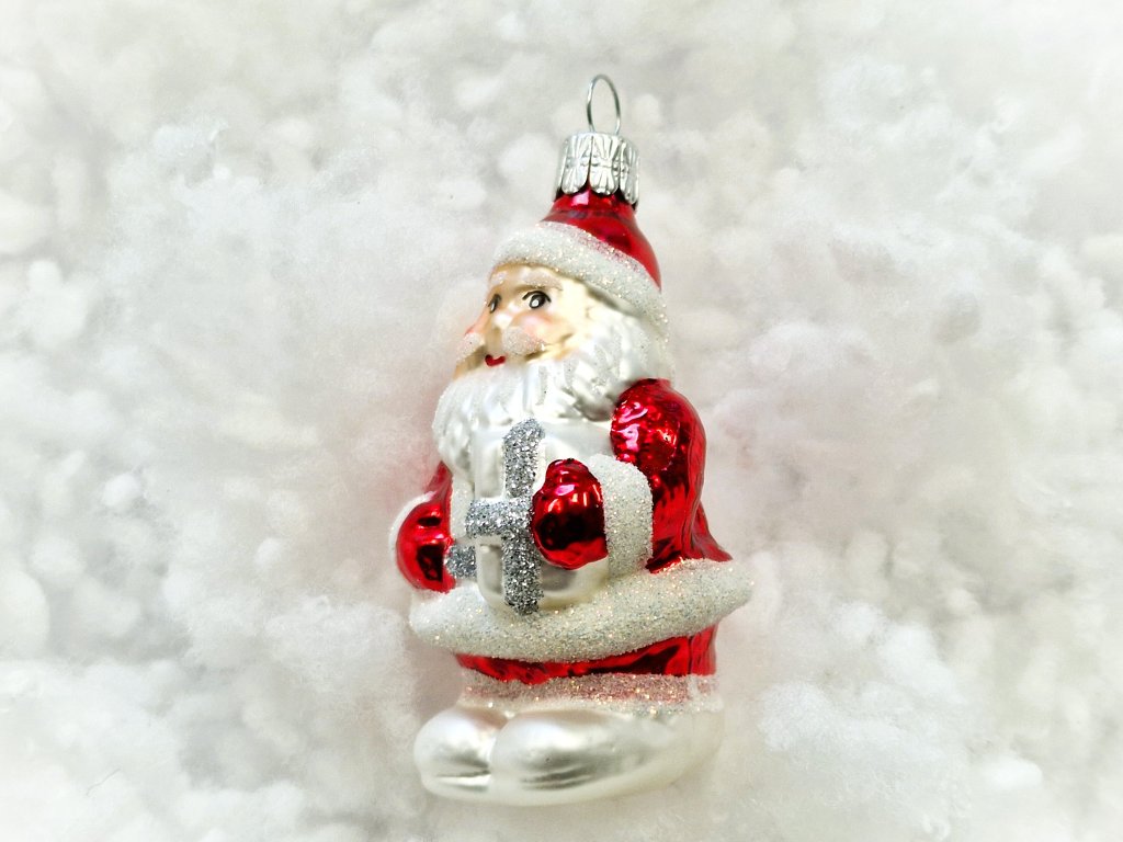 Vánoční ozdoba Santa s balíčkem červenobílý - skleněná vánoční ozdoba na zavěšení.