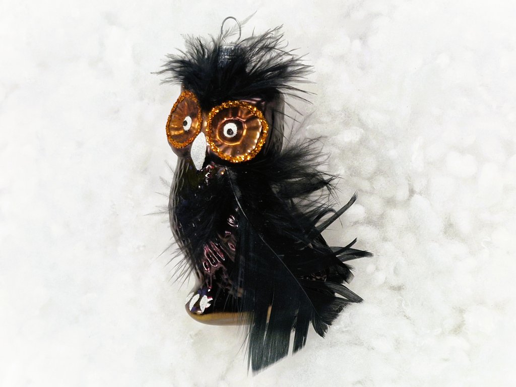 Vánoční ozdoba Černá sova - skleněná vánoční ozdoba na zavěšení ve tvaru sovy, černá barva.