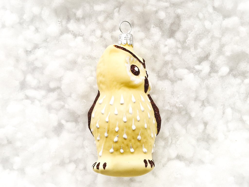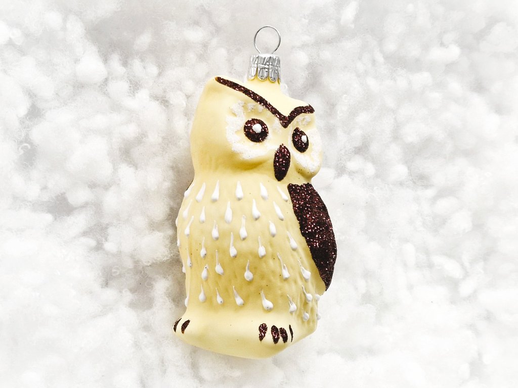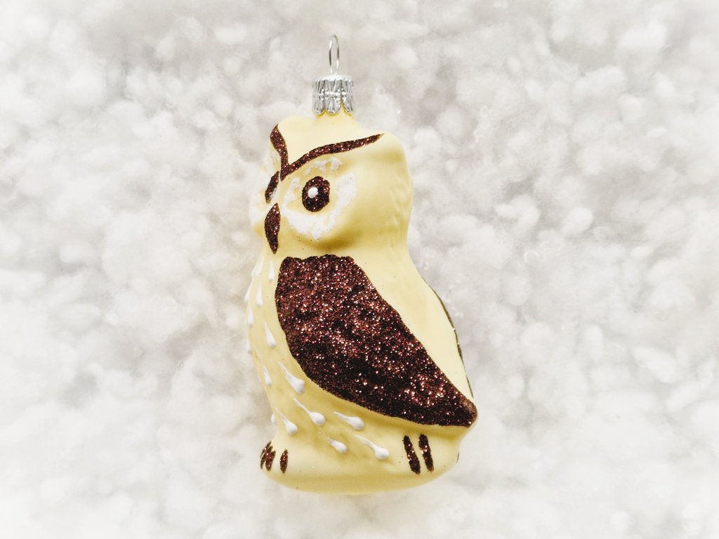 Vánoční ozdoba Sova vanilka - skleněná vánoční ozdoba ve tvaru sovy, barva vanilka (světle žlutá) + hnědá.