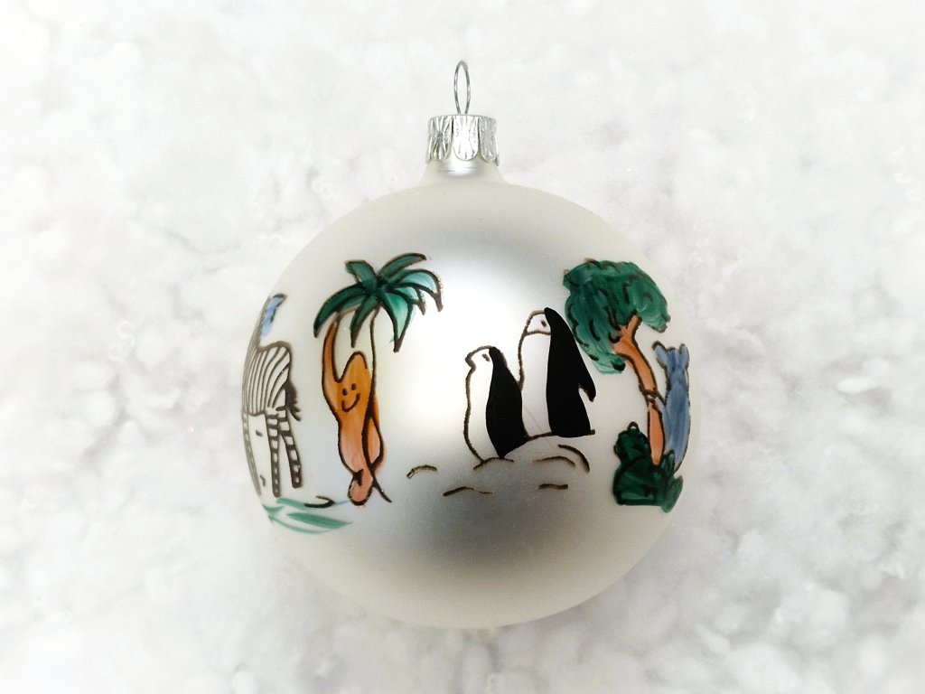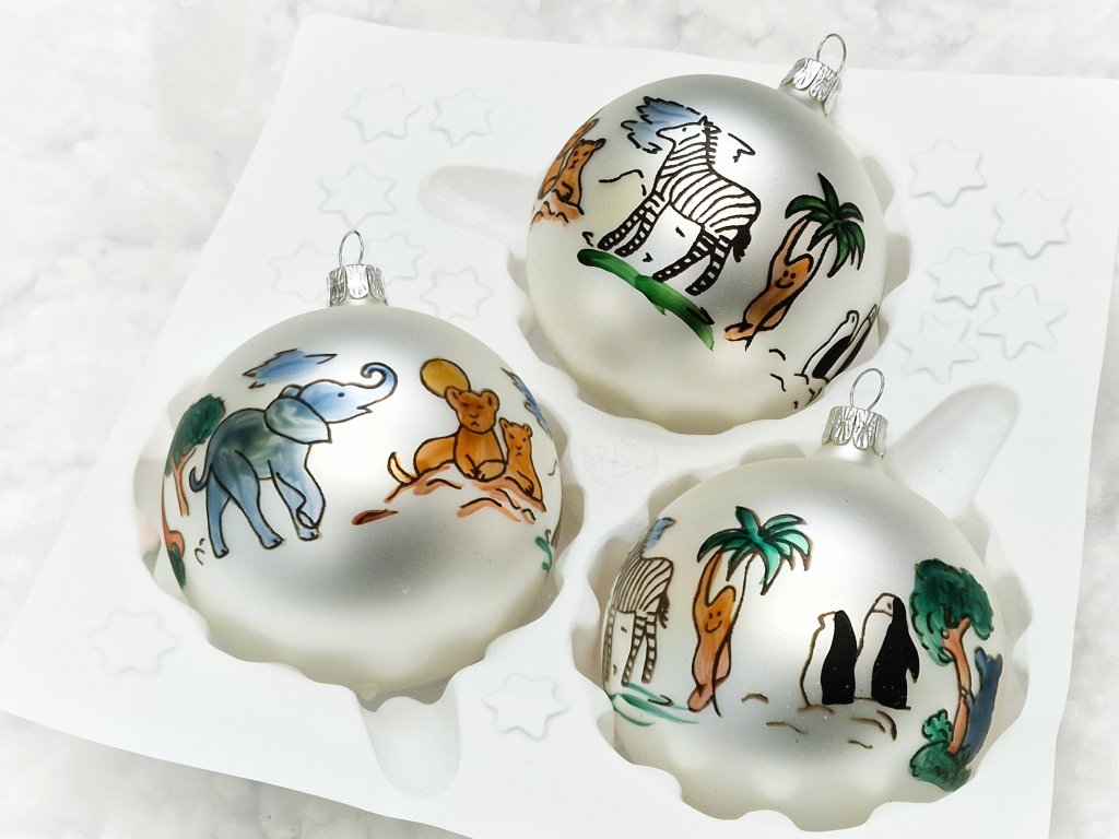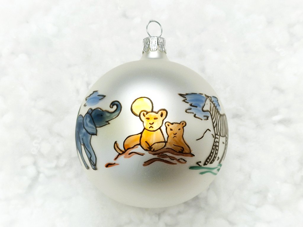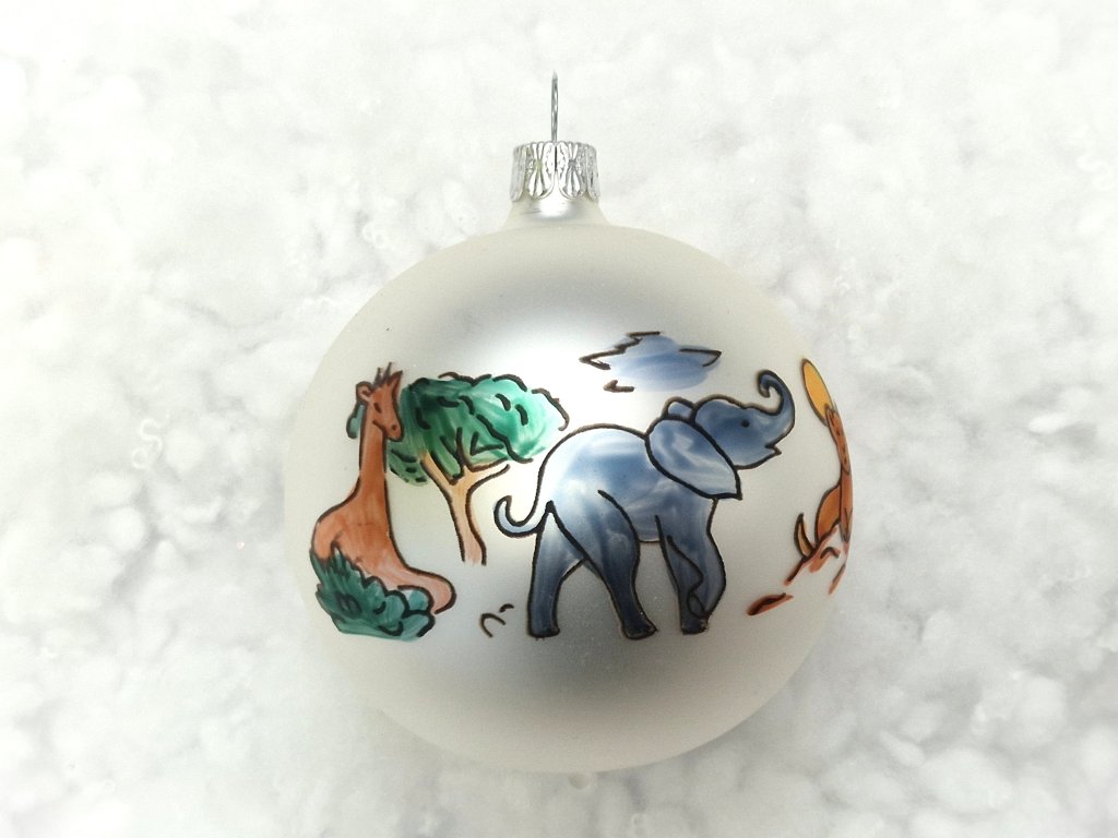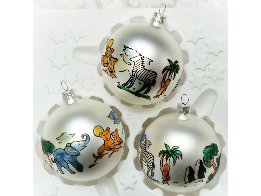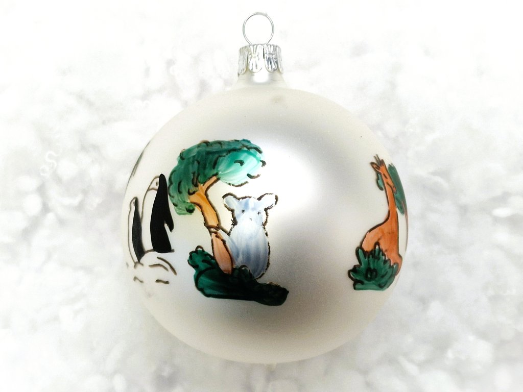 Vánoční ozdoby Zvířátka safari - skleněná vánoční ozdoba koule s malovanými zvířátky. Všechny ozdoby v sadě jsou identické, zvířátka jsou různá po celém obvodu vánoční ozdoby.