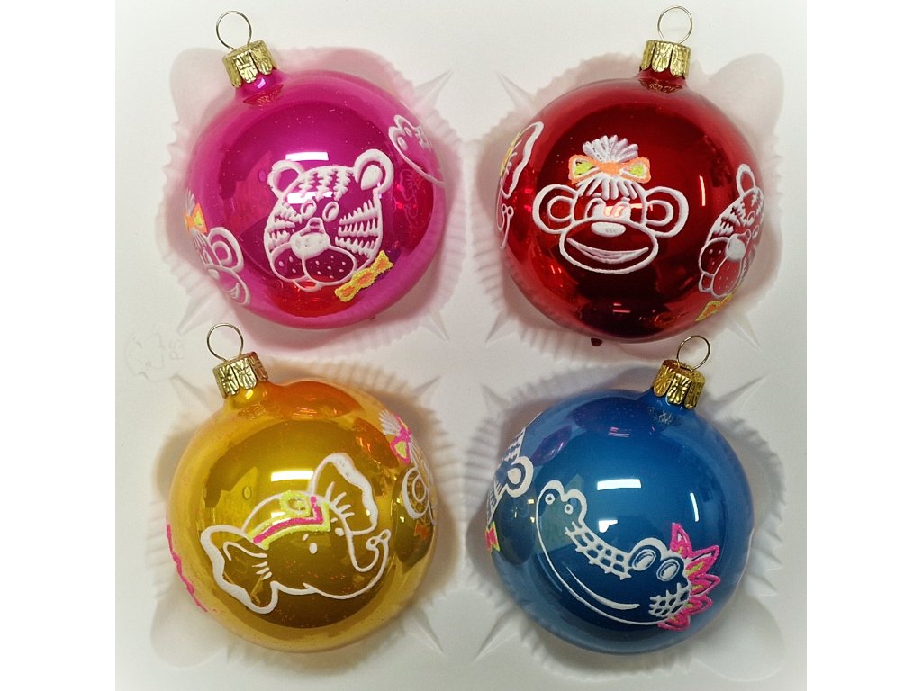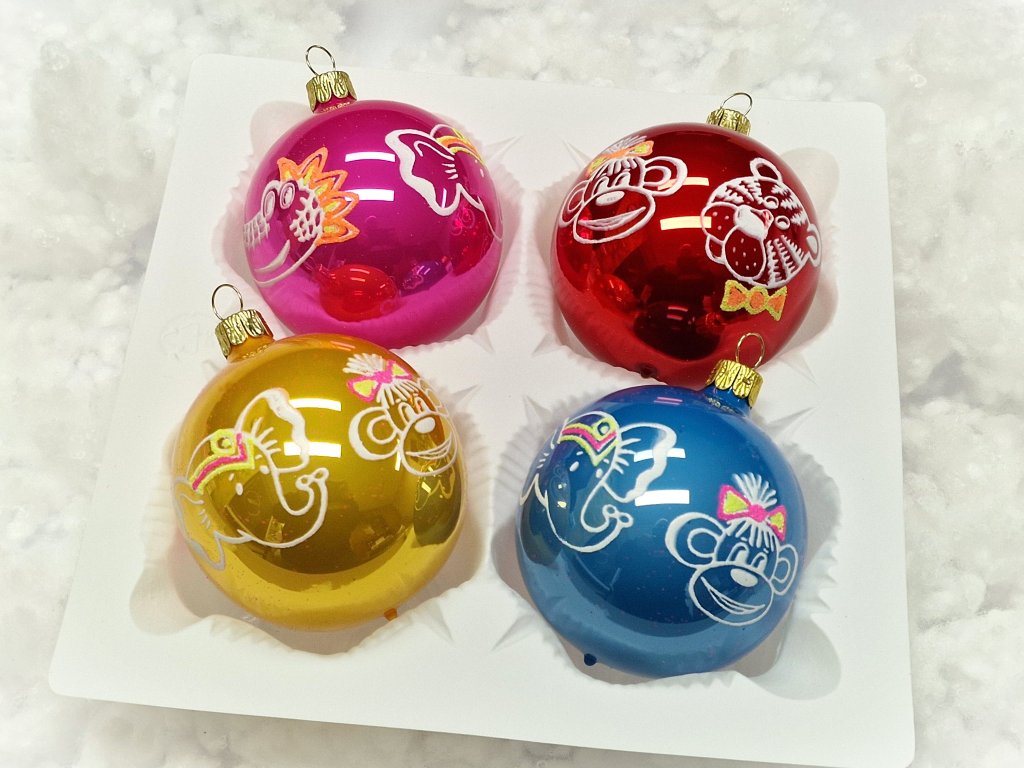 Vánoční ozdoby Zvířátka ze ZOO, sada 4 ks - skleněné vánoční ozdoby ve tvaru koule v barevném mixu (červená, žlutá, modrá, růžová). Každá ozdoba má na sobě stejný potisk se 4 zvířátky (opice, tygr, slon a krokodýl), liší se jenom základní barvy ozdob.